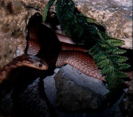 Verbreitung: Süd-Papua Neu Guinea, Indonesien (Irian Jaya), Australien (New South Wales, Nord Territorium, Queensland, West Australien) Taipane sind die bekanntesten und gefürchtetsten Giftschlangen,der Taipan ist die giftigste Landschlange.Taipane sind sehr bewegliche Tiere. Bevorzugte Habitate trockene Wälder und offene Graslandschaften. Sie sind sowohl am Tage als auch in der Dämmerung aktiv. Die etwa 13 mm langen Giftzähne injizieren das Gift in die Beute. Es handelt sich hauptsächlich um kombinierte Nerven- und Blutgifte. Das Taipangift lähmt einerseits und verhindert anderseits die Blutgerinnung. Aus diesem Grund ist dieses Gift auch für den Menschen so gefährlich. Typische Vergiftungssymptome sind Lähmungen der Atemwege, Benommenheit, Krämpfe, Schweißausbruch und unstillbare Blutungen. Der Taipan hat einen schlanken Körper und kann eine Länge von bis zu 3 Metern erreichen. Der Körper dieser Giftnatter ist hell- oder dunkelbraun gefärbt. Sein Kopf hat oftmals eine hellere gelblich-cremefarbene Färbung. Zur Hauptnahrung des Taipans gehören Kleinsäuger, vorzugsweise Ratten und kleinere Beuteltiere. Wie alle australischen Giftnattern ist auch diese Gattung lebend gebärend. Ein Weibchen kann bis zu 30 Jungtiere zur Welt bringen. | ||||||||||||||||||||||||||||||||||||||||||||||||||||||||||||||||||||||||||||||||||||||||||||||||||||
