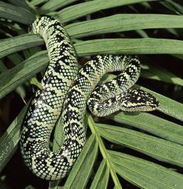 Verbreitung: Thailand, Malaysia, Indoaustralischer Archipel, Celebes, Philippinen. Nahrung: Mäuse, während sie in der freien Natur auch Vögel, Eidechsen und Frösche fressen. Lebendgebährend. Die Waglers Lanzenotter lebt im Dschungel desFlachlands und auf Plantagen in niederen Bäumen und Buschwerk. Auch hält sie sich an Flussrändern, der küstennahen Mangrovenwäldern und Sümpfen auf. Der Körper dieser Giftschlange ist von plumper Körperform. Ihre Körperfärbung ist sehr auffällig,über die gelbgrüne bis weisse Oberseite ziehen schwarze Querstreifen, die grünen Schuppen sind von schwarzen Säumen umgeben. Auf den Körperseiten wird die Tönung gelblich bis weiss. Auch die Ober- und Unterlippenschilde haben einen gelben Farbton. Sie erreicht ca eine länge von ca. 1 Meter. Der breite, dreieckige Kopf verengt sich zum Hals hin stark. | ||||||||||||||||||||||||||||||||||||||||||||||||||||||||||||||||||||||||||||||||||||||||||||||||||||